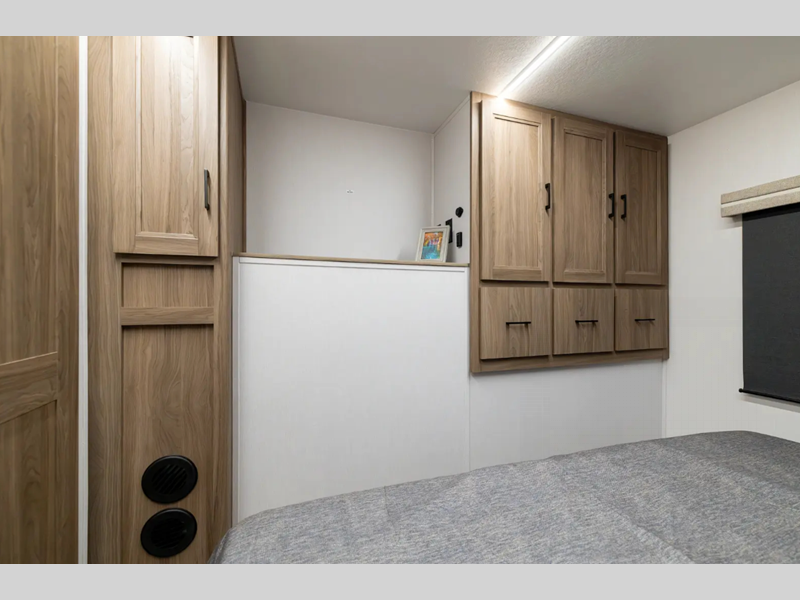 Each model is constructed with vacuum bonded walls with durable Azdel Composite, Dicor Tufflex PVC roofing, and a 3/4 gel coated fiberglass cap with an automotive glass windshield. The 81" interior height will provide more standing room, and the wear-resistant vinyl flooring is ultra durable. Head outside to find a power awning with an LED light strip, a pet leash/bottle opener, a power tongue jack, plus many more convenient amenities.