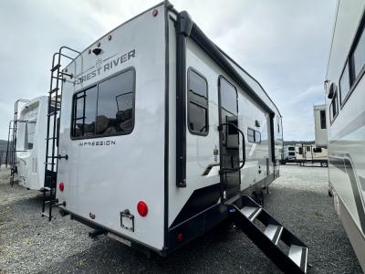 With any Impression fifth wheel by Forest River, the focus of the design is comfort and value, built with quality craftsmanship and attention to customer's desires in each Impression! The exterior includes upgraded E-rated tires, custom exterior graphics package, and insulated slam latch baggage doors. There is also an enclosed docking station, an outside shower, and a 100W roof panel for off-grid capabilities. The fully heated and enclosed AccessiBelly has removable underbelly panels along with enclosed tank valves. There is an industry leading 15K A/C plus 35K BTU furnace to keep you comfortable. The interior has lumbercore cabinetry, residential linoleum, residential backsplash in the kitchen, and oversized opening windows in the living area for more natural lighting and good air flow.