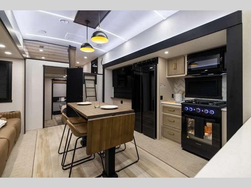 Sleeps 8 Slides 2 Length 37 ft 10 in Ext Width 8 ft Ext Height 13 ft 3 in Hitch Weight 1985 lbs Dry Weight 10064 lbs Cargo Capacity 3921 lbs Fresh Water Capacity 57 gals Grey Water Capacity 62 gals Black Water Capacity 30 gals Number Of Bunks 2 Available Beds Custom King Refrigerator Type 12V Refrigerator Size 16 cu ft Cooktop Burners 3 Number of Awnings 1 Water Heater Type On Demand Tankless AC BTU 15000 btu TV Info LR 50" LED Smart TV Awning Info 9' 6" and 18' Electric with LED Lights Axle Count 2 Washer/Dryer Available Yes Shower Type Walk-In Shower Electrical Service 50 amp Similar Floorplans