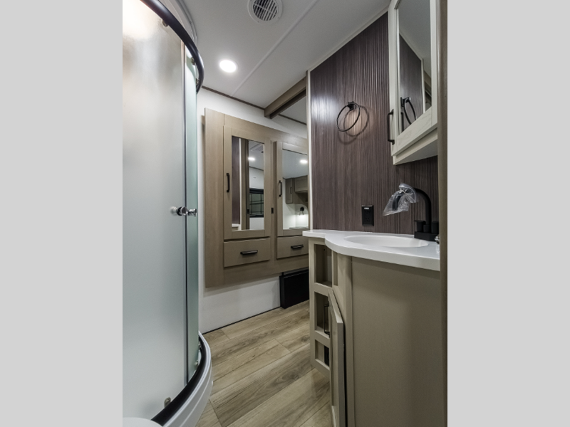 Reflection is built with the Arctic 4-Season Protection package which provides a 35K BTU high-capacity furnace, double insulated roof and front cap, a heated and underbelly with circulating heat, and 12V heat pads on the holding tanks to mention a few features that allow you to travel during any climate. The interior offers residential cabinetry, a deep-seated stainless-steel kitchen sink in the gourmet kitchen, a spacious shower with a glass door, and ductless flooring in the living area to name a few comforts.