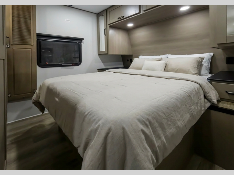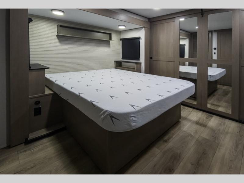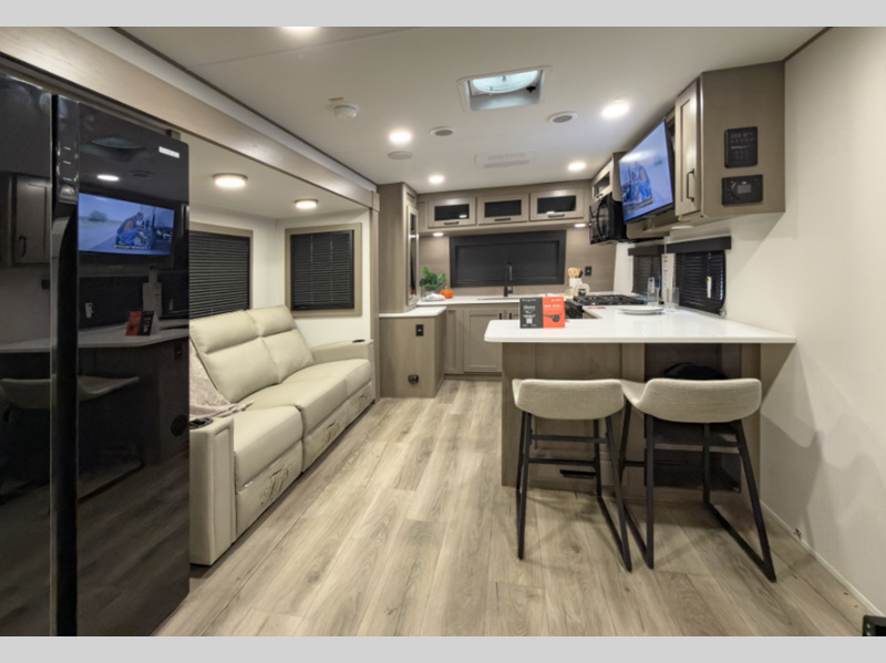 Reflection is built with the Arctic 4-Season Protection package which provides a 35K BTU high-capacity furnace, double insulated roof and front cap, a heated and underbelly with circulating heat, and 12V heat pads on the holding tanks to mention a few features that allow you to travel during any climate. The interior offers residential cabinetry, a deep-seated stainless-steel kitchen sink in the gourmet kitchen, a spacious shower with a glass door, and ductless flooring in the living area to name a few comforts.