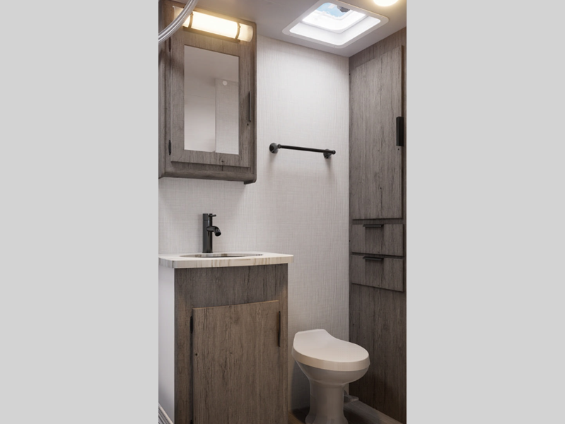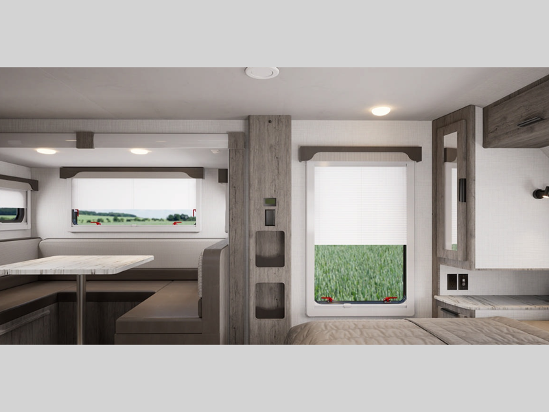 Each model is constructed with thermopane Euro windows, a molded fiberglass front cap, and Azdel interior panel walls for durability. There is Lite-Ply cabinet construction inside, along with Surf-X suedo solid surface lightweight countertops and tables, decorative backsplash, and many more interior comforts. Outside, the Keyed-Alike storage compartment doors will keep your gear secure and the exterior wash station will make it easy to wash off camp gear.