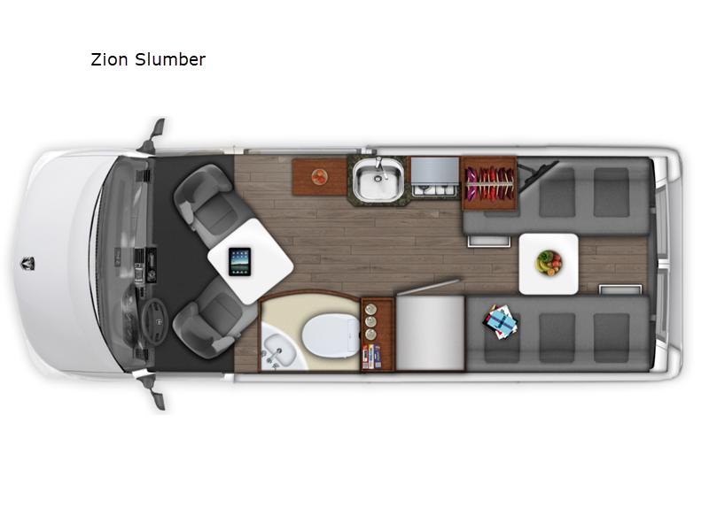 This Zion Slumber model takes the Zion models to a whole new level of comfort. The pop top allows you to separate your sleeping space from your living and dining area, plus you can invite more friends along to sleep on the side-facing rear power sofas that can convert to twin beds or a king-size bed. Easily bring along food in the 5.3-cu. ft. refrigerator and slide-out pantry, plus there is a counter extension to prep meals each day. The exposed center aisle gives you more storage space to bring larger gear such as bikes or kayaks, and the wet bath includes a marine toilet, sink and a shower to wash up after your excursions.