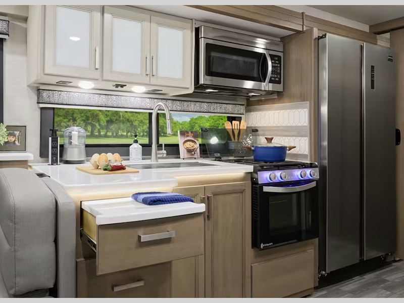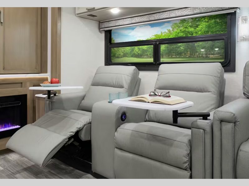 The cockpit has everything you could need, including reclining and swivel leatherette captain's chairs which also share a stow away coffee table. A dash work station will allow you to work on the go, and a 14" touchscreen dash radio with Bluetooth, Android Auto, Apple CarPlay and Sirius/XM radio will make the drive that much easier. Built on the Ford F53 chassis, the Luminate offers a sleek full body paint with gel coated sidewalls that are sure to turn heads at the campground. An 8000-lb. trailer hitch is ready to tow your vehicle, and the automatic leveling jacks with touchpad controls make setup easy when you arrive.